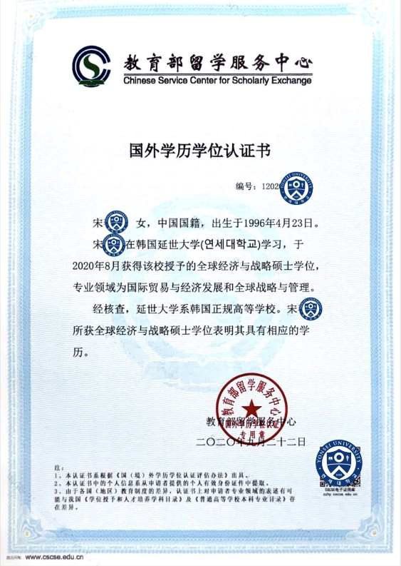 三个校区(MIRAE-未来,新村,国际)学位证完全相同,均具由校长名义签发,中国教育部留学服务中认证心《国外学位学历认证书》也完全相同,无校区标注与区分。 |