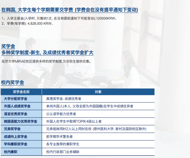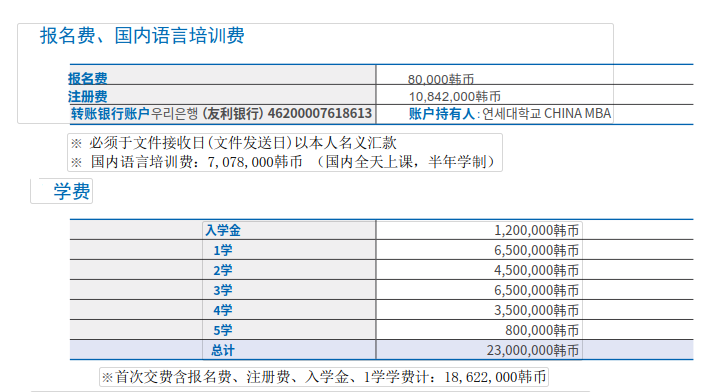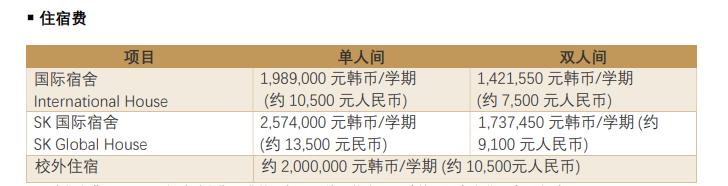 ●本科入学注册费10,450,000KRW(约5.5万RMB),每期学费4,828,000KRW(约2.55万RMB);入学前合计缴纳费15,278,000KRW(约8.8万RMB);第二学期起学费自己交; ●iMBA阶段入学注册费11,002,000KRW(约5.8万RMB),学费约23,000,000KRW(约12.17万RMB)。首次交费约9.8万RMB。 ●国内韩语培训费另计。 |