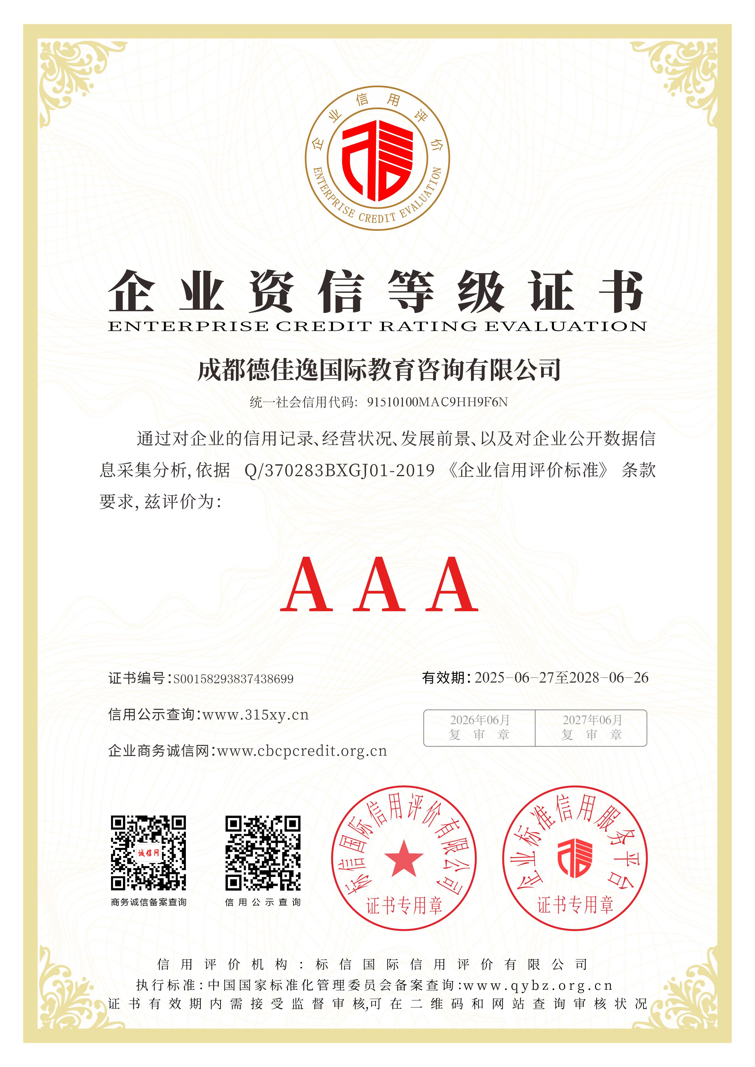 AAA级认证作为企业信用评定的最高等级,需通过财务状况、管理水平、社会评价等72项指标的严格审核。德佳逸凭借规范的内部控制体系、零行政处罚记录及98%的客户满意度,成为四川省少数同时具备教育资质与AAA信用评级的复合型服务机构。公司法定代表人表示:"这将显著提升我们在政府采购、银行授信、国际合作的竞争力,预计可为客户降低20%以上的服务保证金比例"。