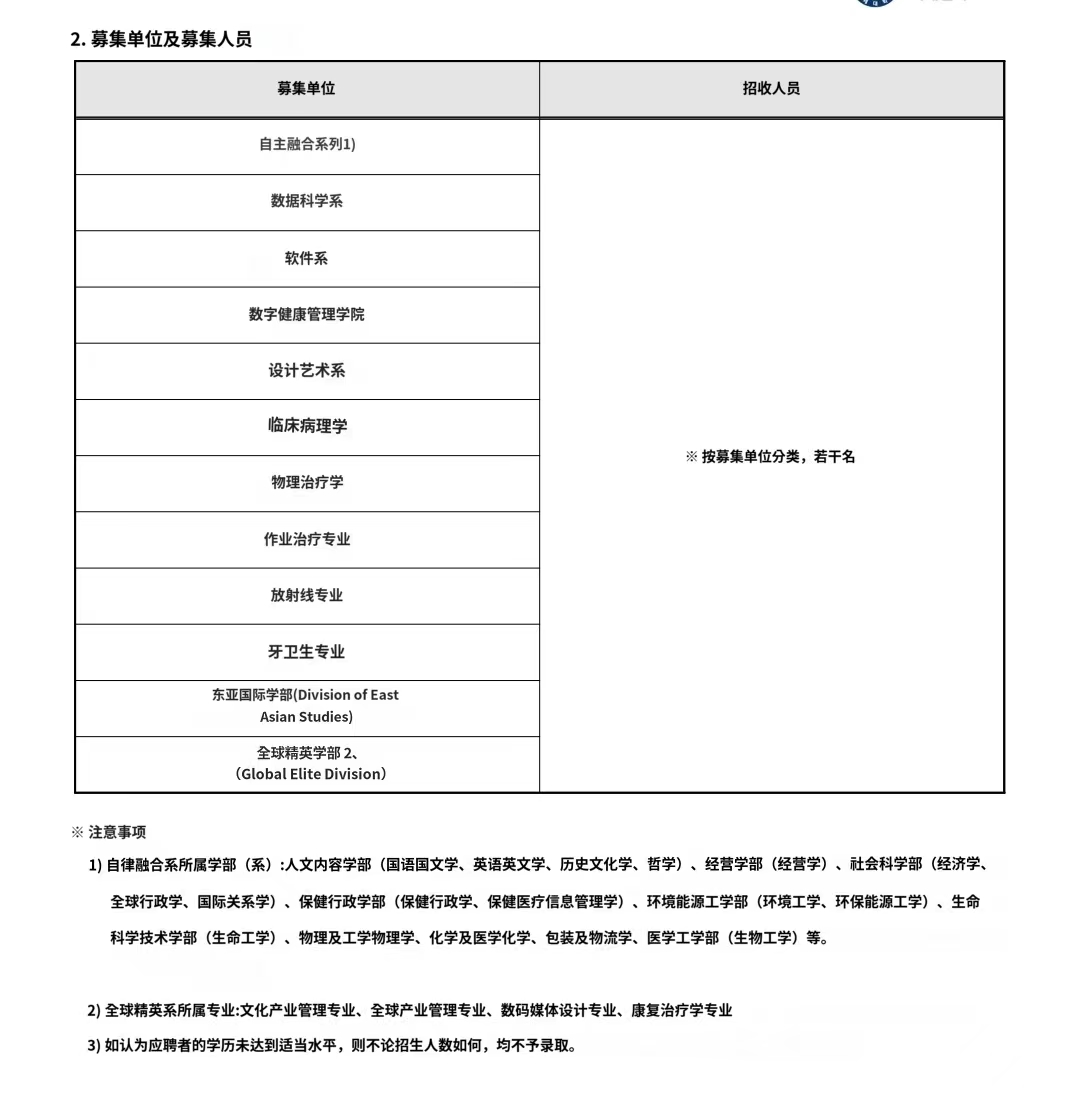 (以下医学等10个专业须达到韩国语要求,东亚国际部英语授课,精英学部4个专业可无语言入学,大一以韩语学习为主)