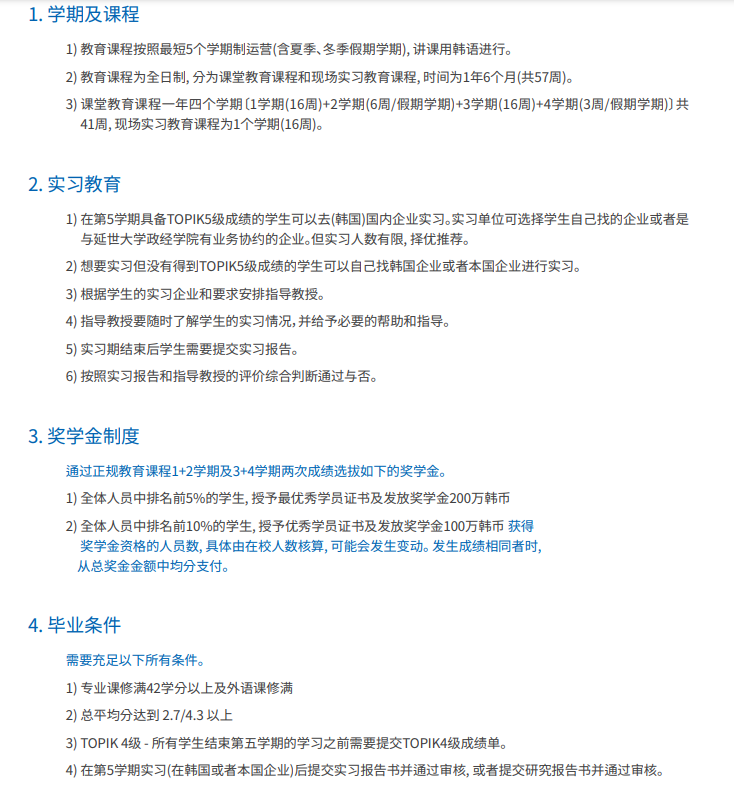 (4) 模式:国内1年(语言学习并获得TOPIK3级或以上等级) 韩国4年(韩国四年本科,医学、护理除外所有专业,毕业时须修完规定学分,通过TOPIK4级考试。) |