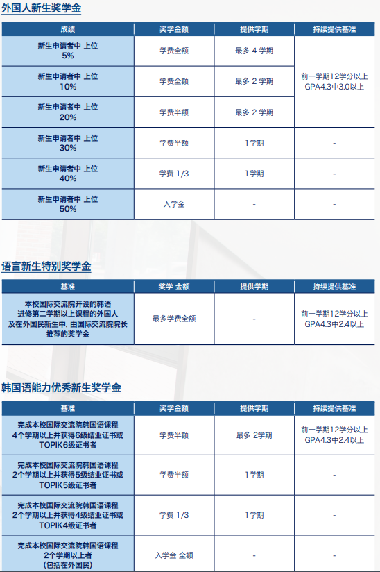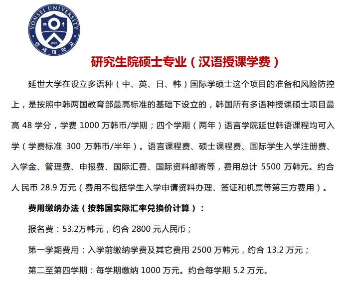 ●本科入学注册费10,450,000KRW(约5.5万RMB),每期学费4,828,000KRW(约2.55万RMB);入学前合计缴纳费15,278,000KRW(约8.8万RMB);第二学期起学费自己交; ●iMBA阶段入学注册费11,002,000KRW(约5.8万RMB),学费约23,000,000KRW(约12.17万RMB)。首次交费约9.8万RMB。 ●国内韩语培训费另计。 |