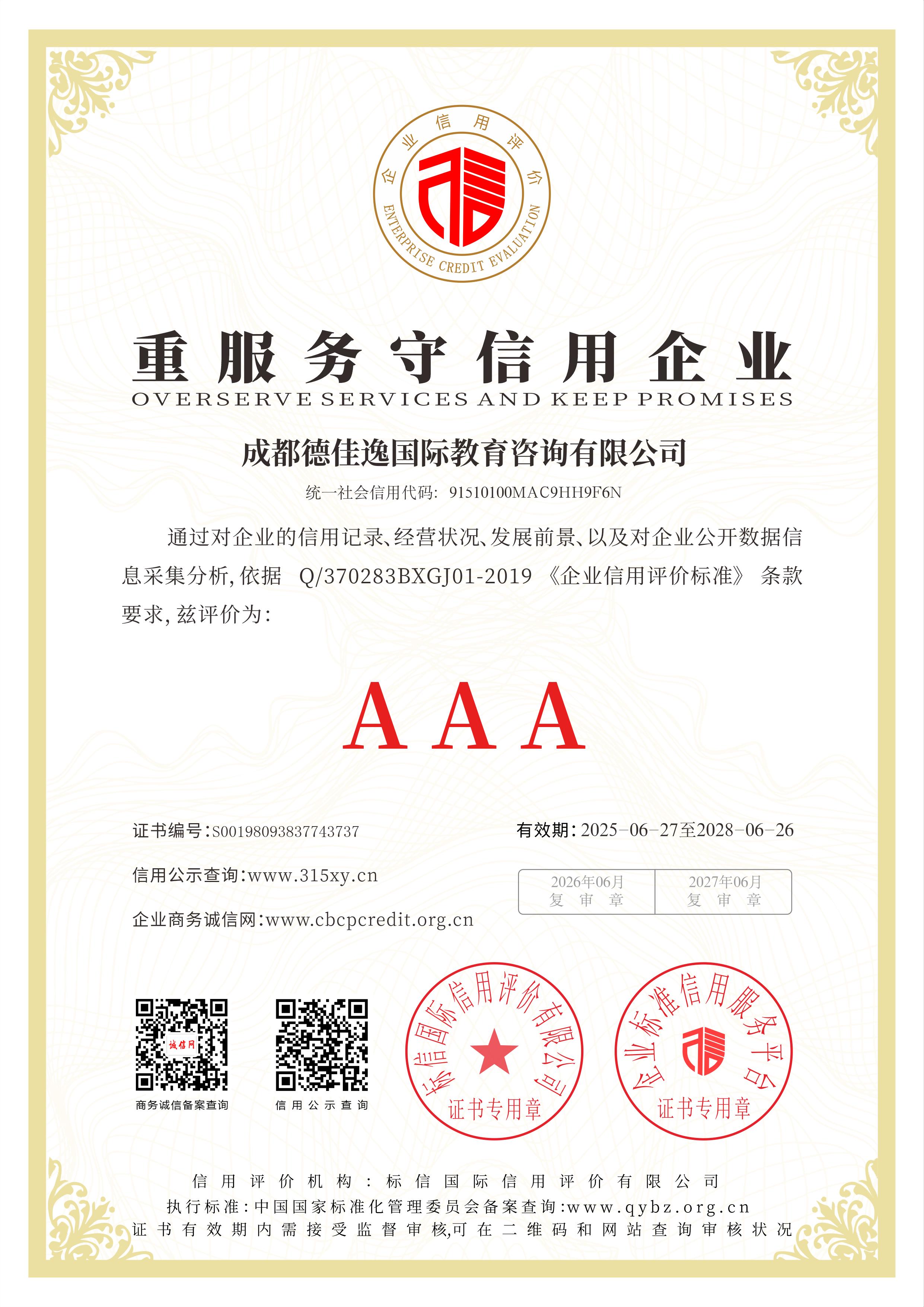 成都德佳逸国际教育咨询有限公司荣膺AAA级企业信用评级